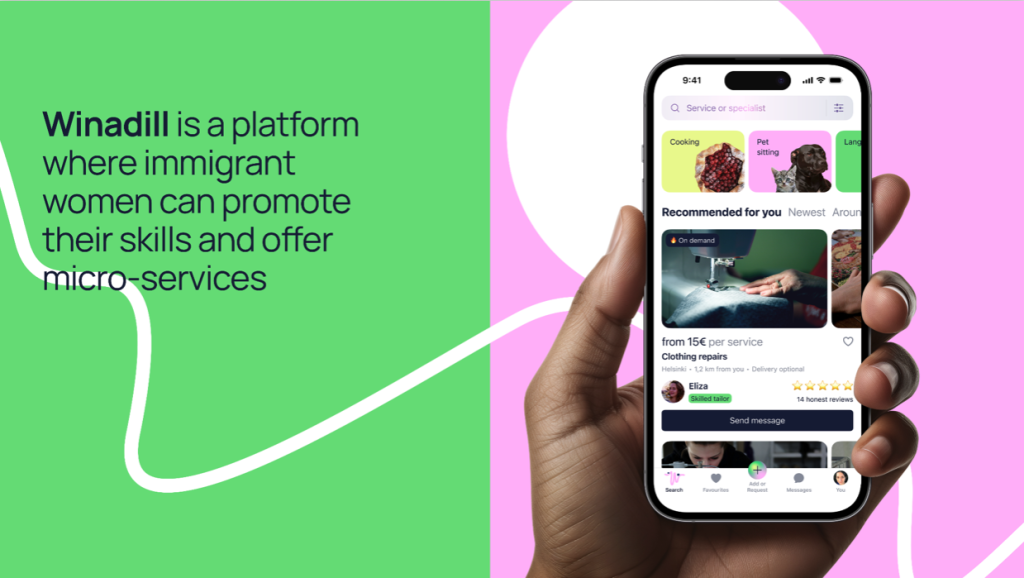 The Winadill Project is a digital platform connecting migrant women with local communities through freelance services such as baking, babysitting, photography, and more. Co-created through research and workshops, the platform fosters social connections, economic empowerment, and inclusion. Its design allows migrant women to contribute their skills, building both visibility and opportunity across diverse audiences.